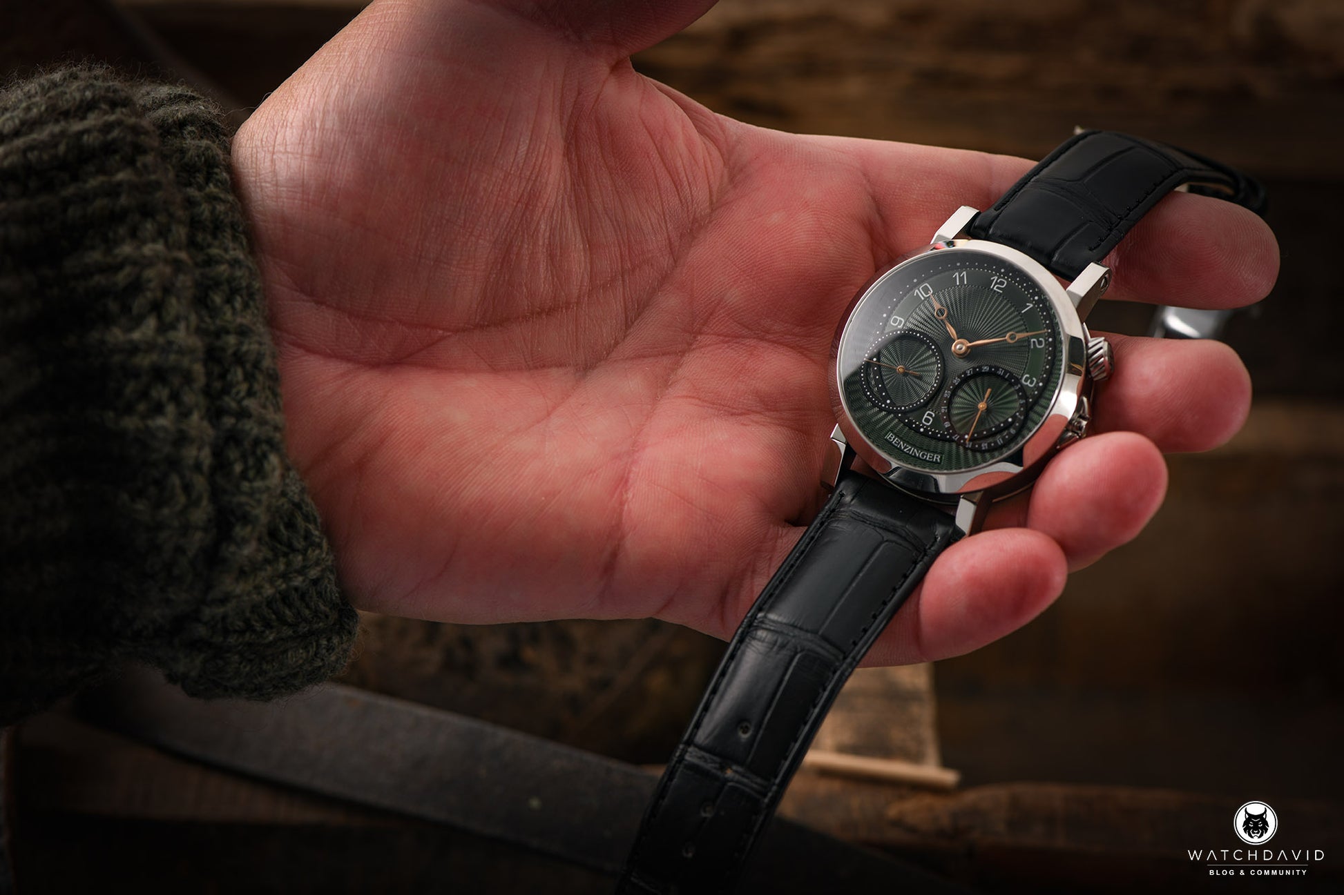 - Own manufactory hand-winding movement, shifted hour and minute indication