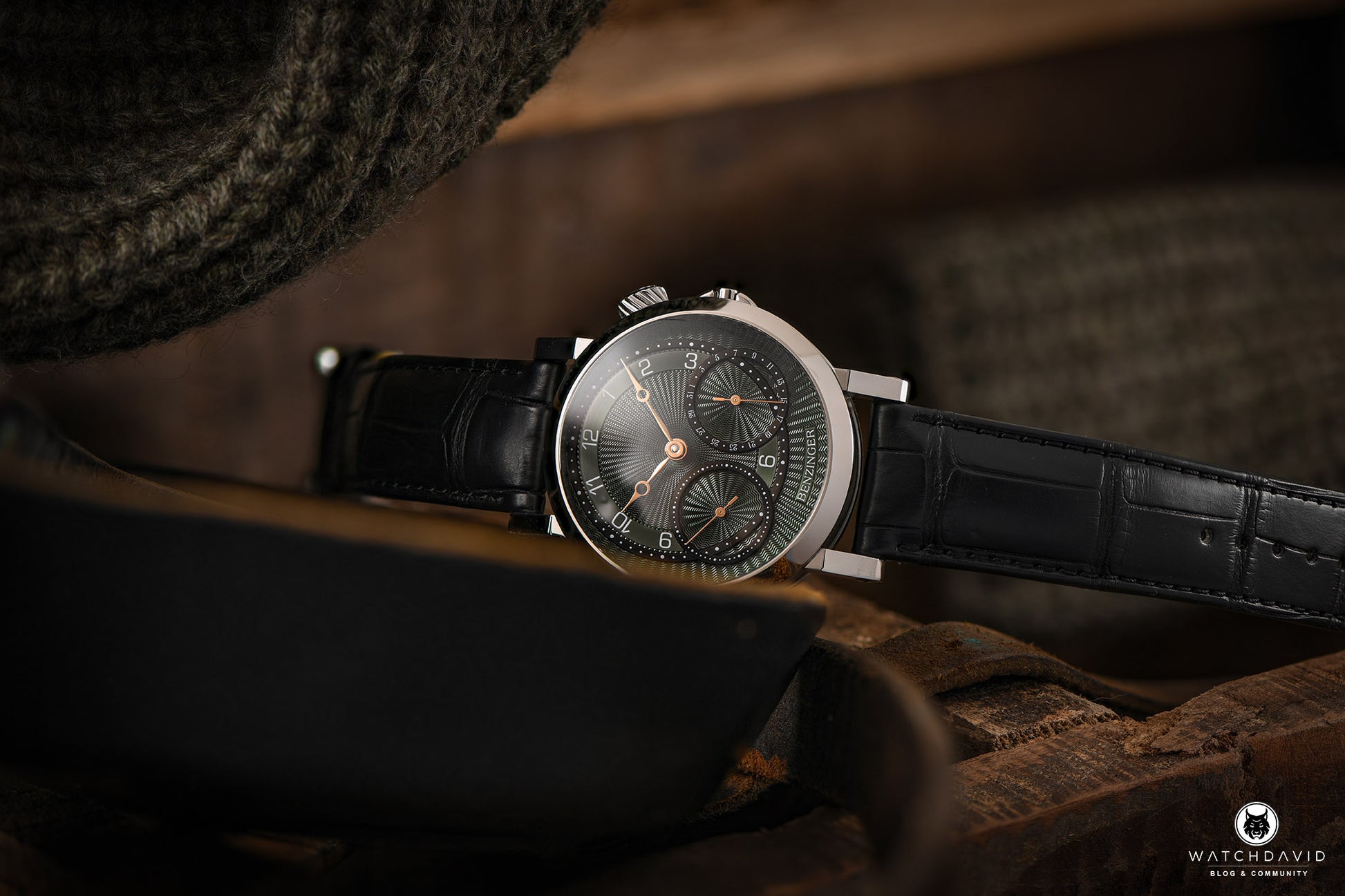 - Hand-sewn alligator leather strap