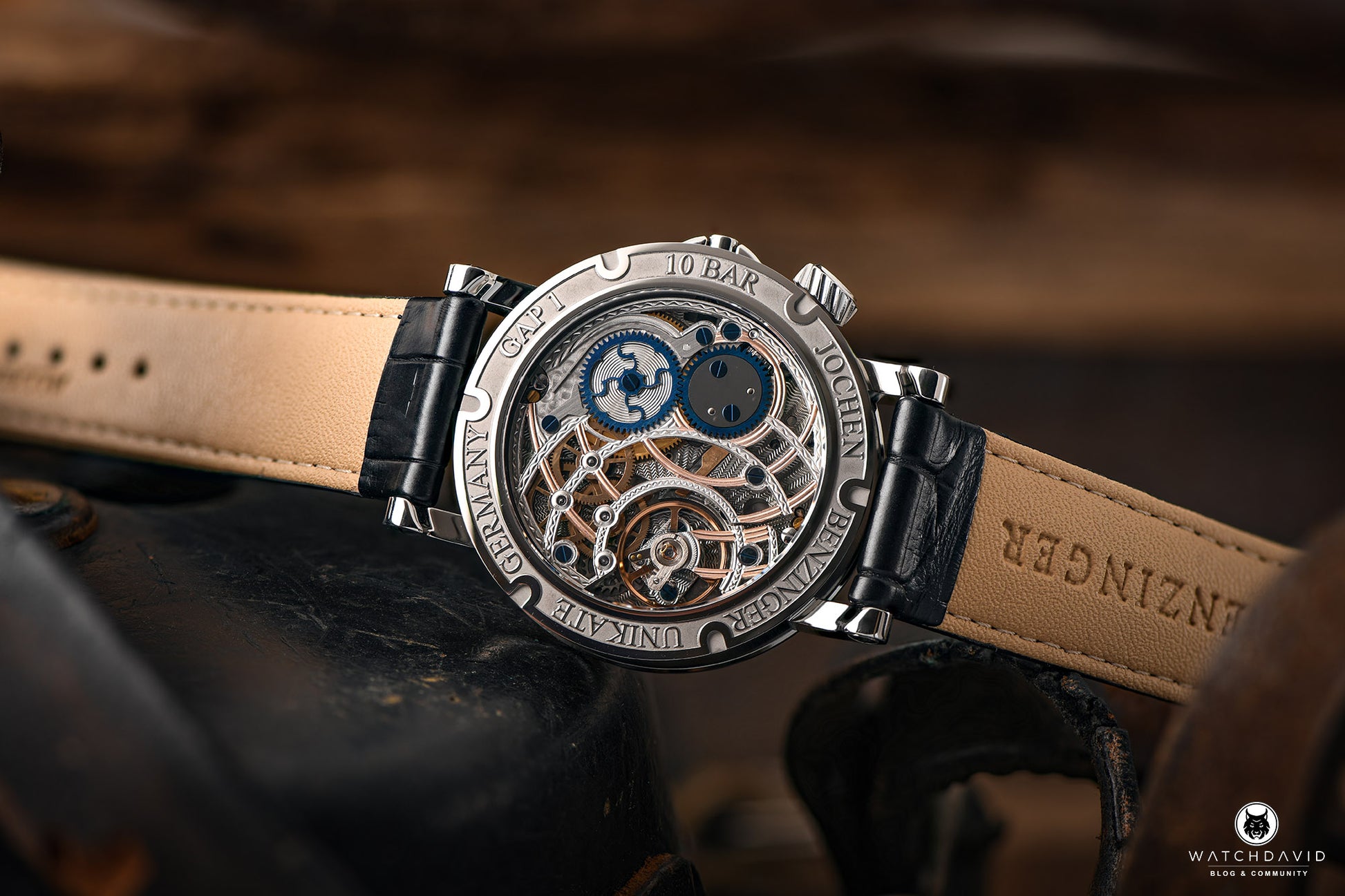 - Hand-guillochéd, rosegold and rhodium plated movement parts