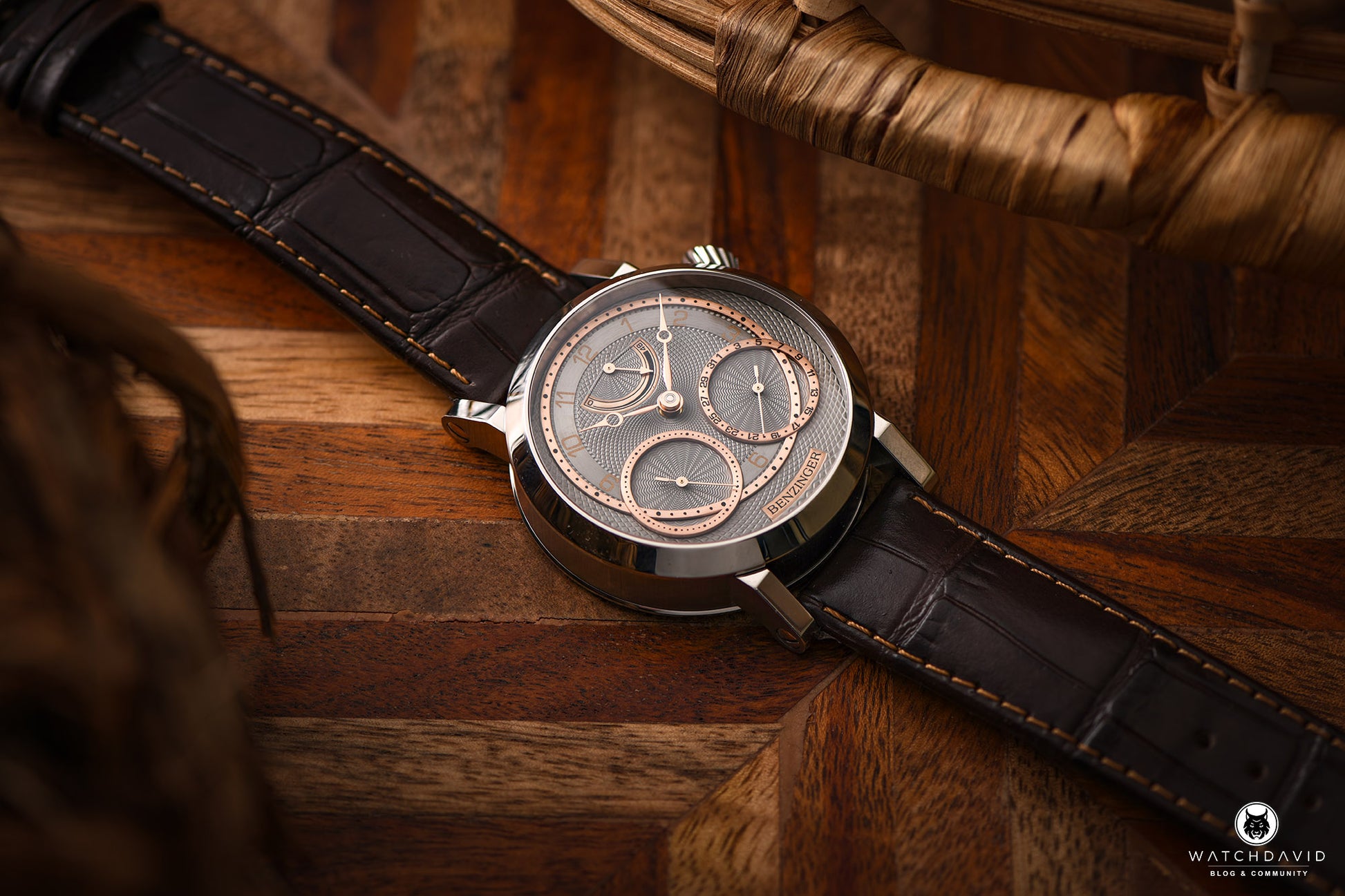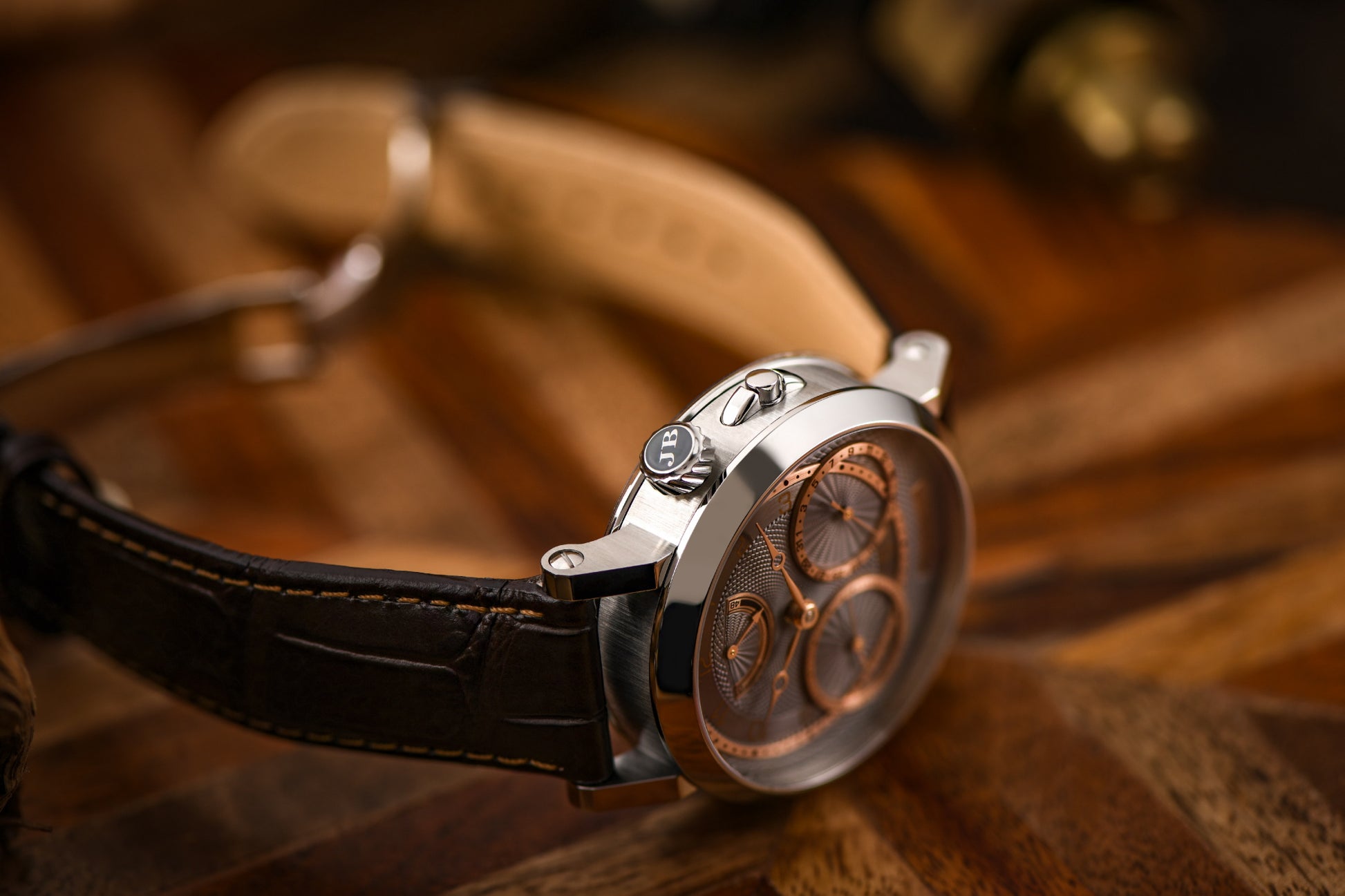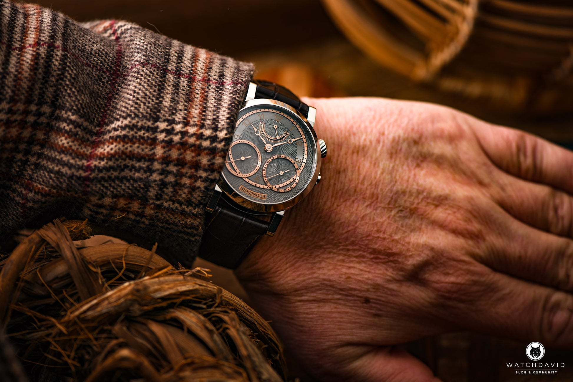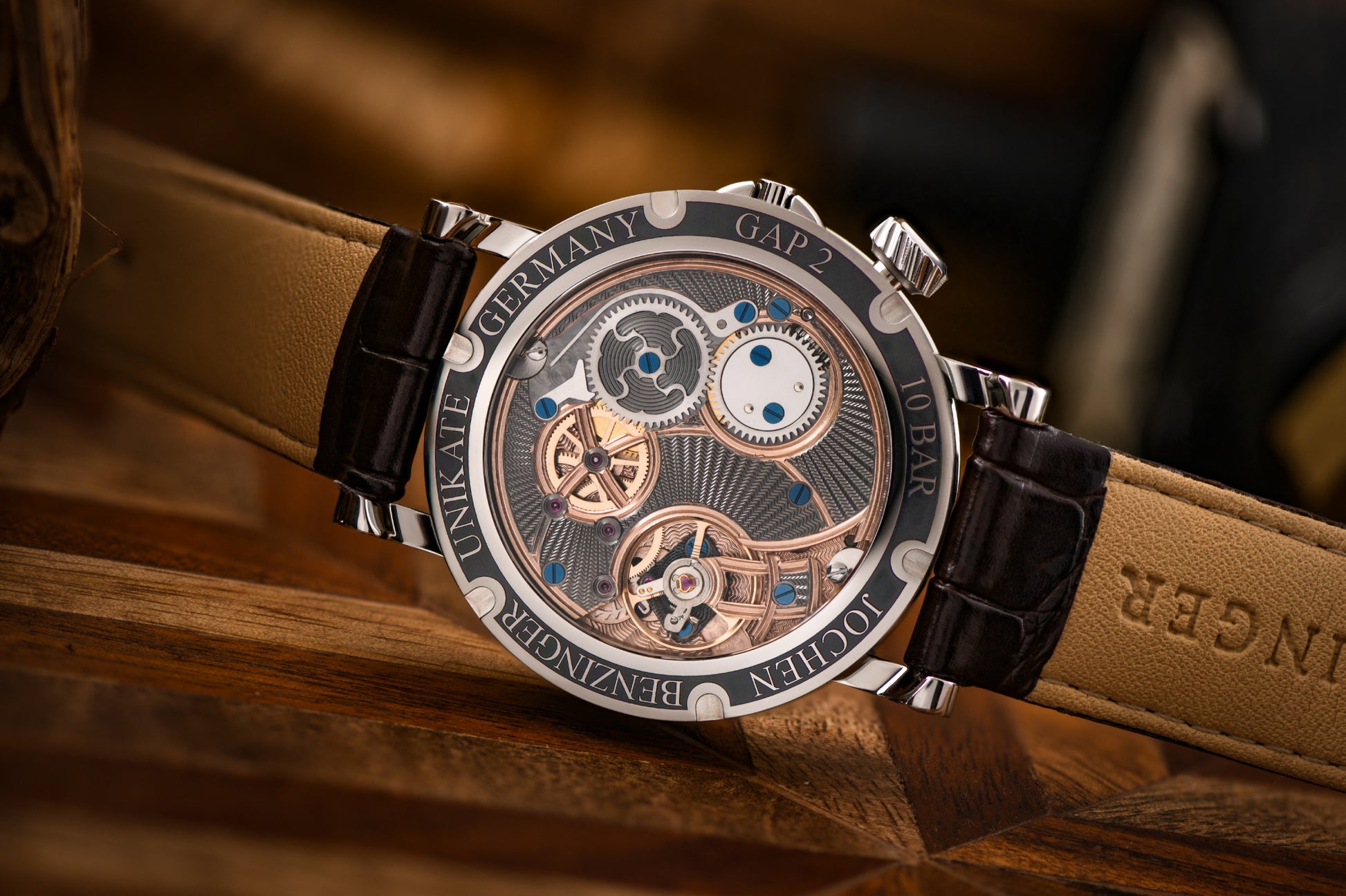 The new version of the GAP 2 is technically even more sophisticated than the GAP 1. The biggest challenge - apart from the offset hours and minutes and the small seconds on the same axis as the date display - was the additional installation of a power reserve (48 hours). Habring managed to install this power reserve via differentials and various additional gear chains in exactly the same place where it now sits: directly below the 12 o'clock display. And this more technical design is also continued on the back of the watch, as the elaborately skeletonized movement has now given way to a hand-guillochéd three-quarter plate, which gives the GAP 2 movement a calmer, more elegant appearance.