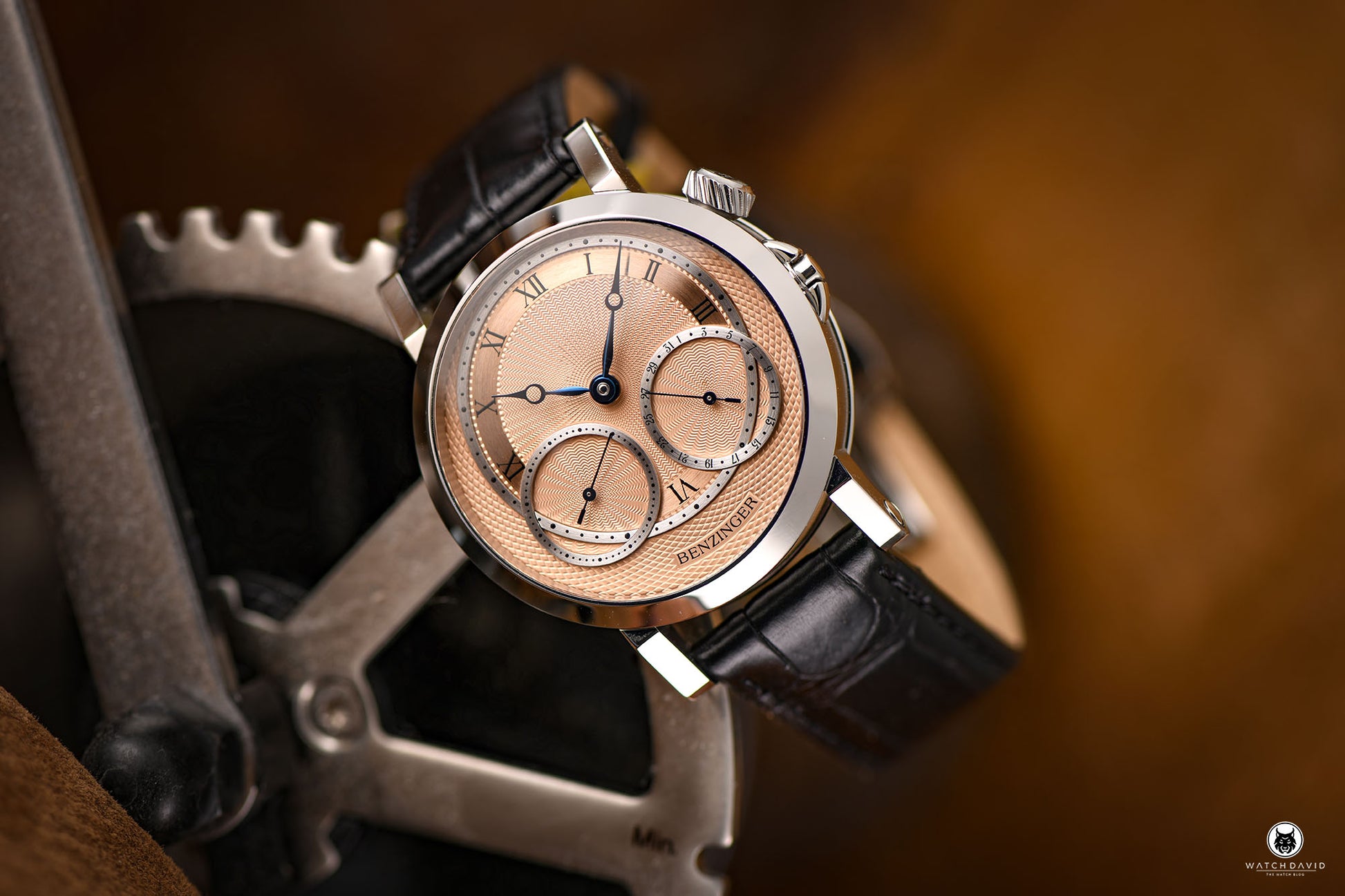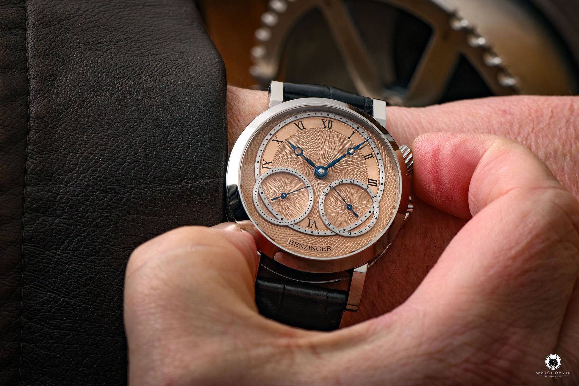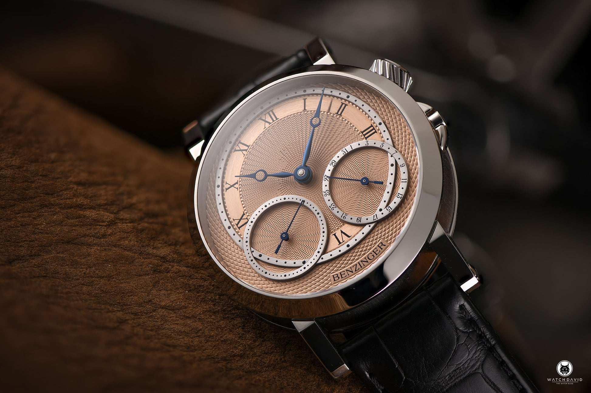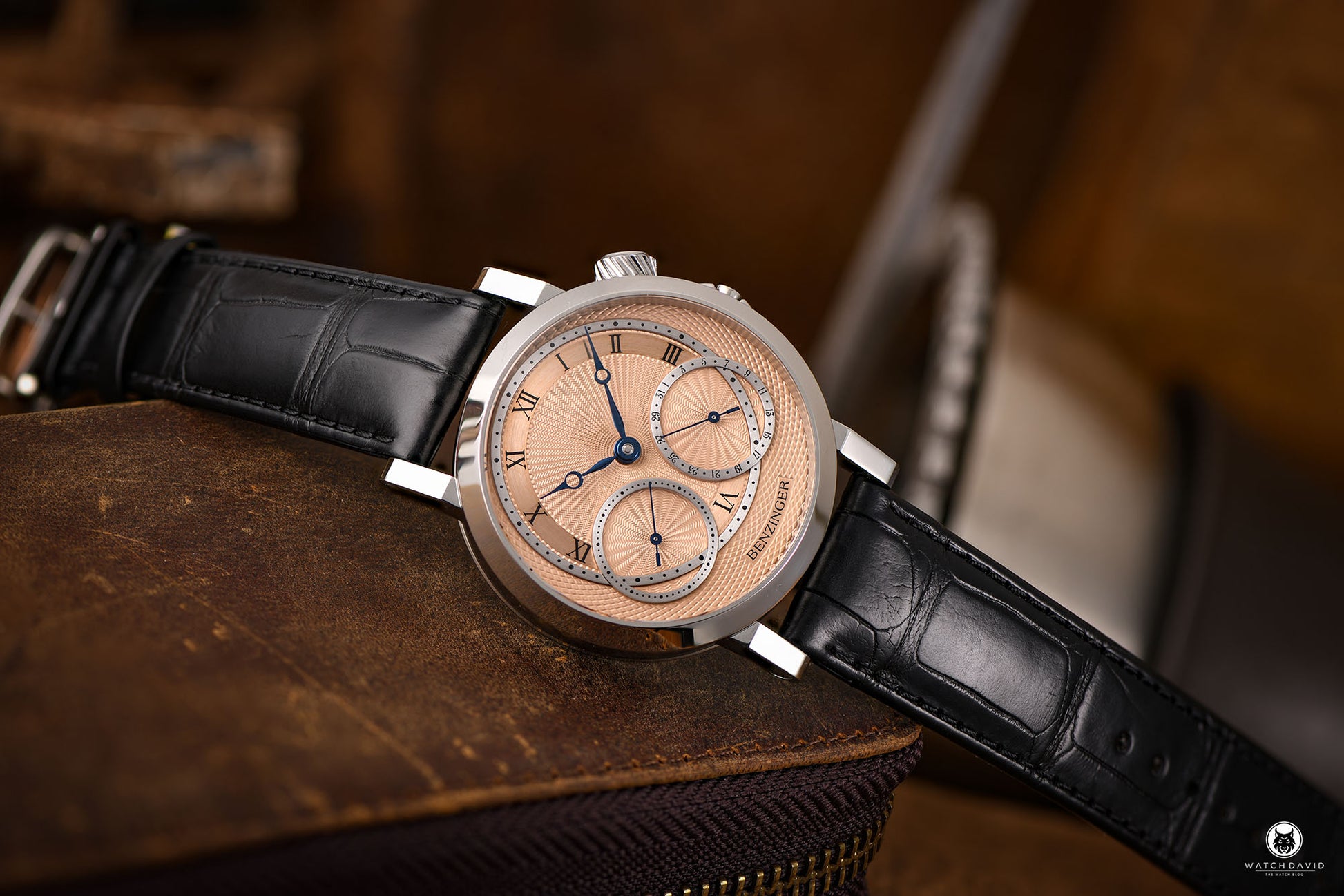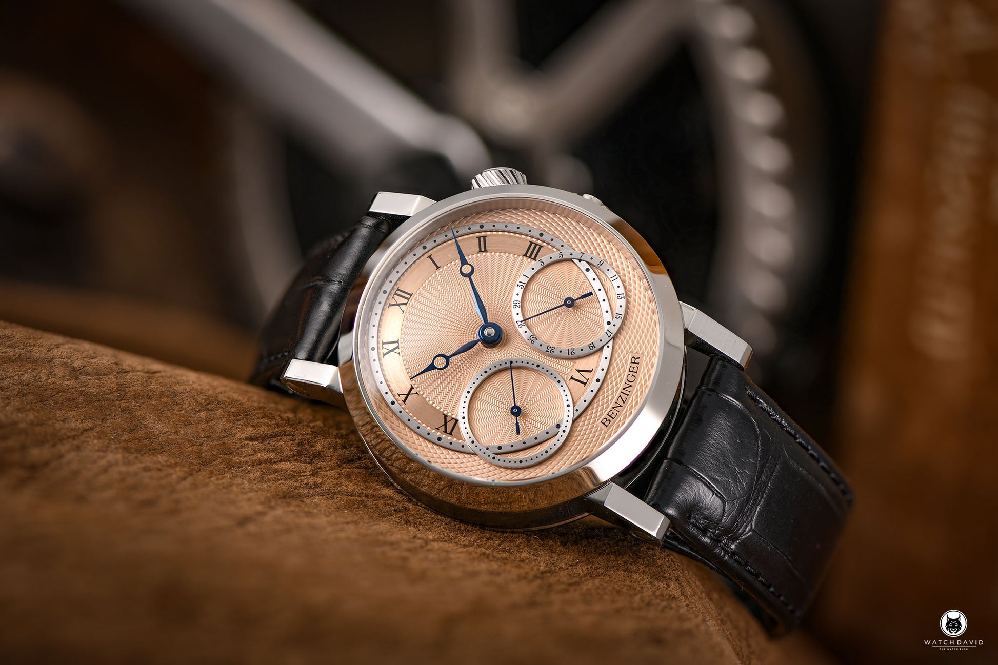 - Own manufactory hand-winding movement, shifted hour and minute indication