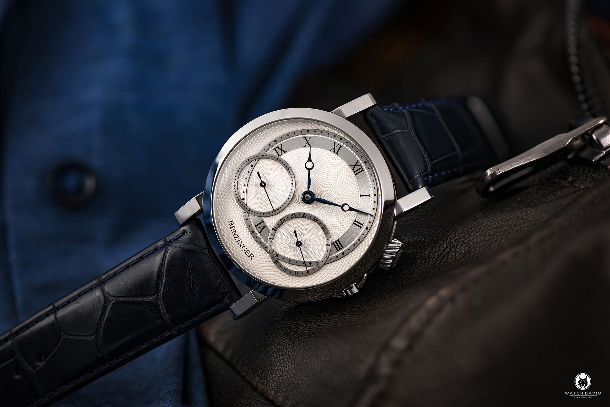 - Own manufactory hand-winding movement, shifted hour and minute indication