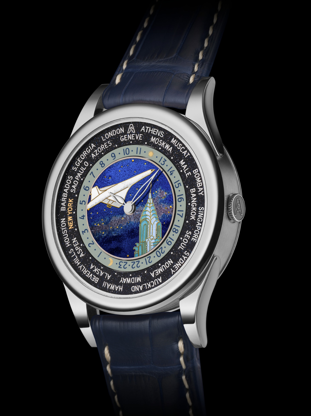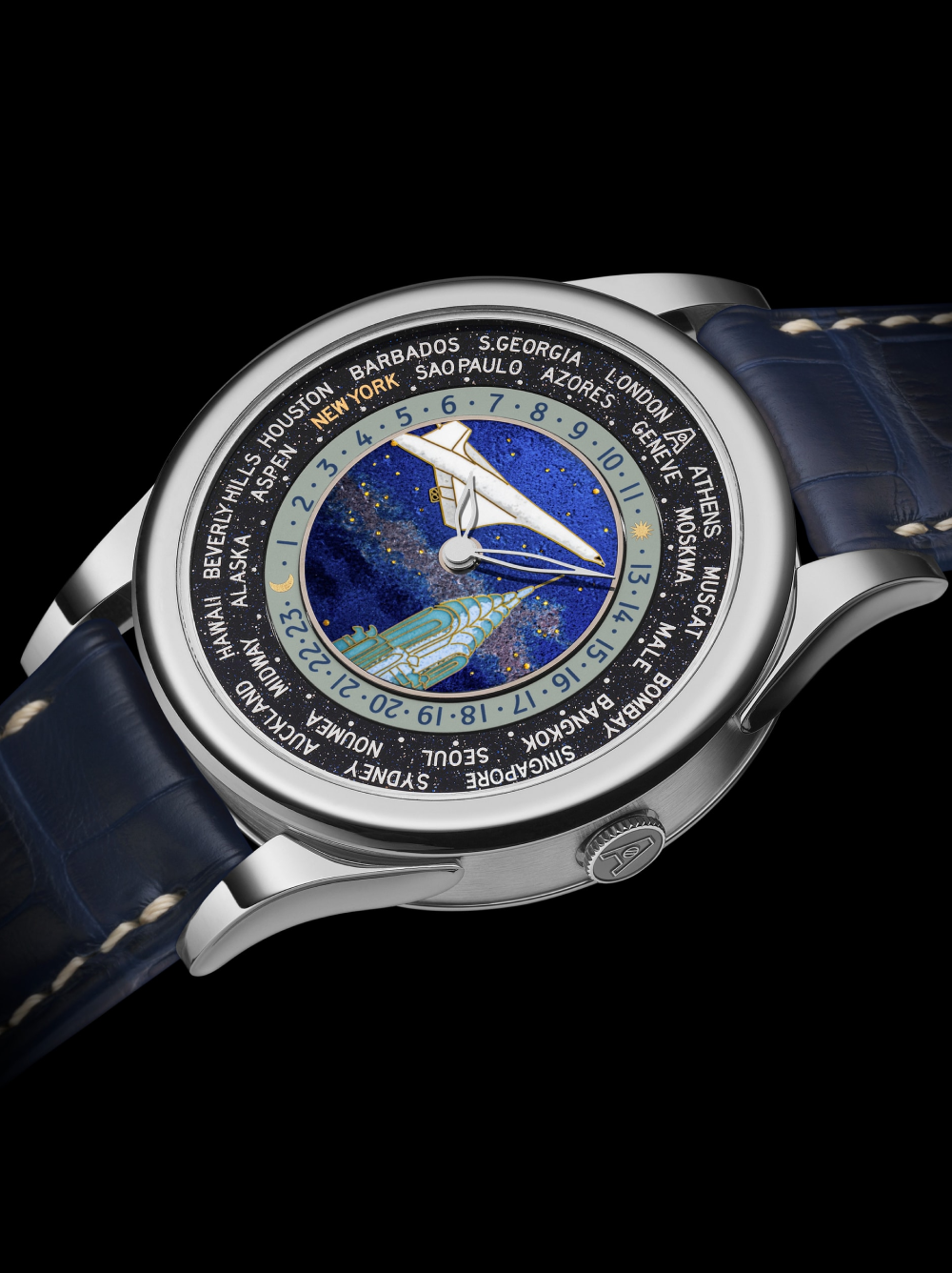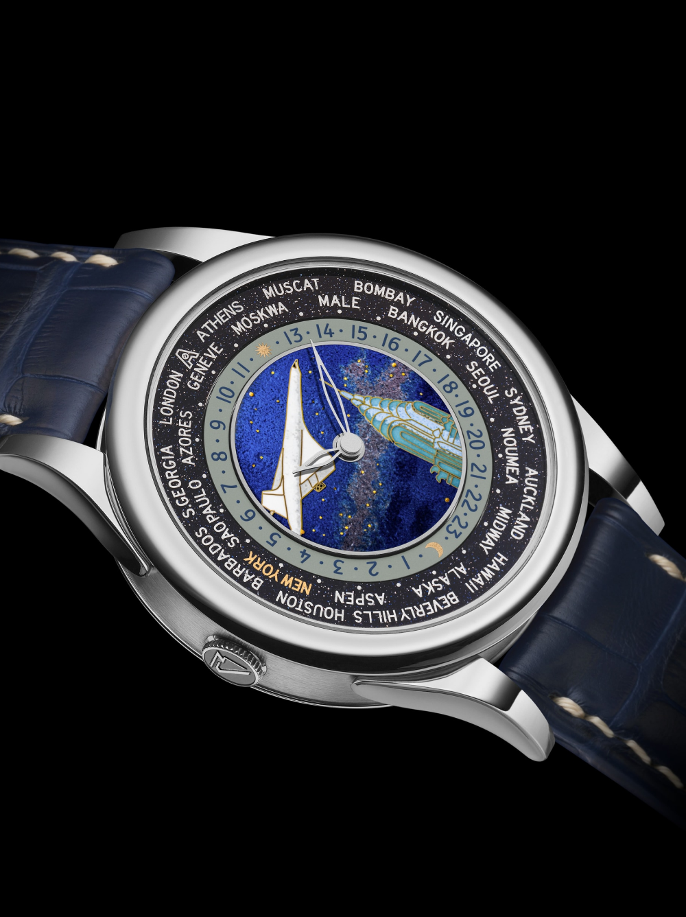 Centre disc: 18mm white gold in cloisonné enamel World time zone scale on an aventurine stone disc