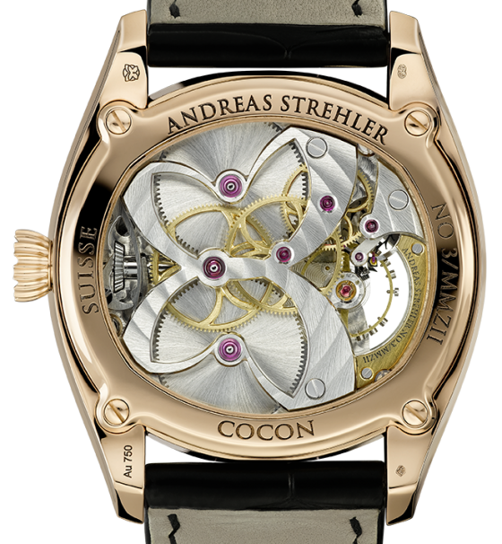 Andreas Strehler’s Cocon is a further development of the Papillon. Whereas the living technology was the main feature of the Papillon, Andreas Strehler now puts the emphasis on the readability of the time, the precise time. Time, and its division, was to be emphasized, by a three-dimensional dial. This was done without diverting from his basic technological principles.