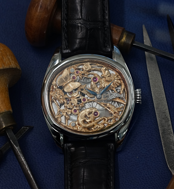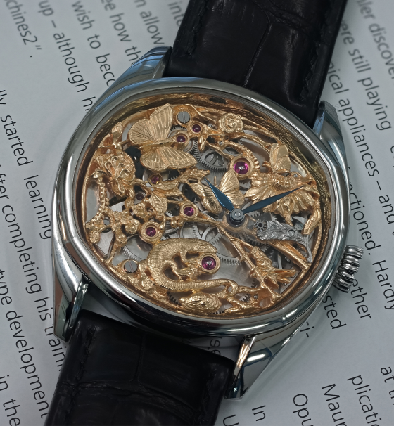 The photos are with the first engraving we made, called Jardin des Papillons, but this is just an example. Only bespoke piece will be made there, each client can choose what to engrave on his/her watch.