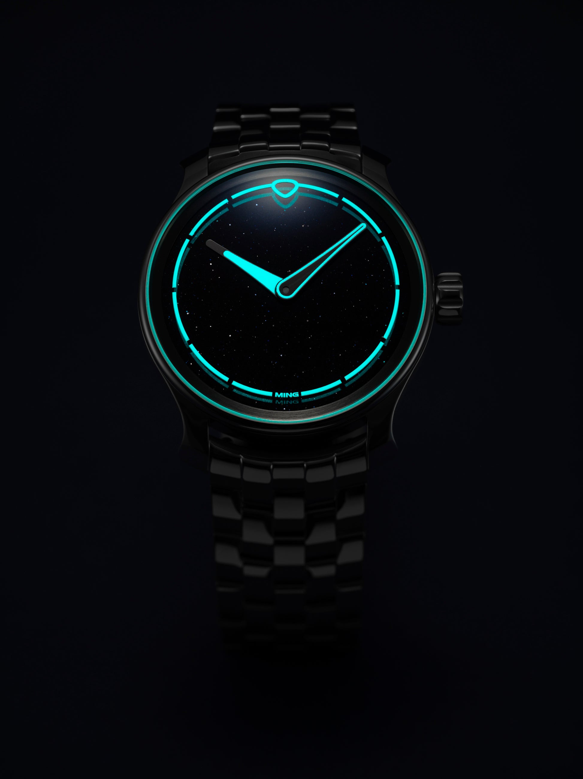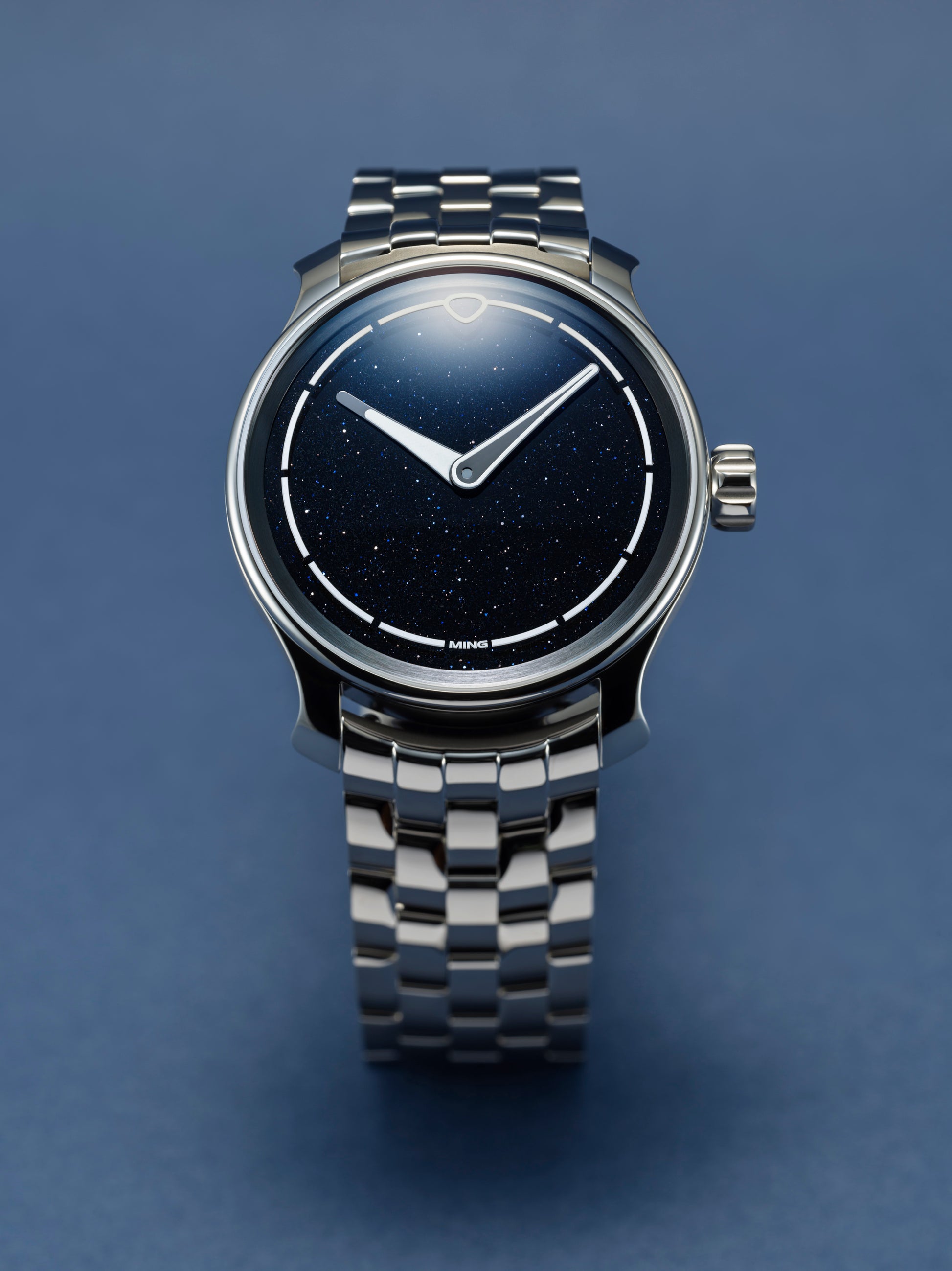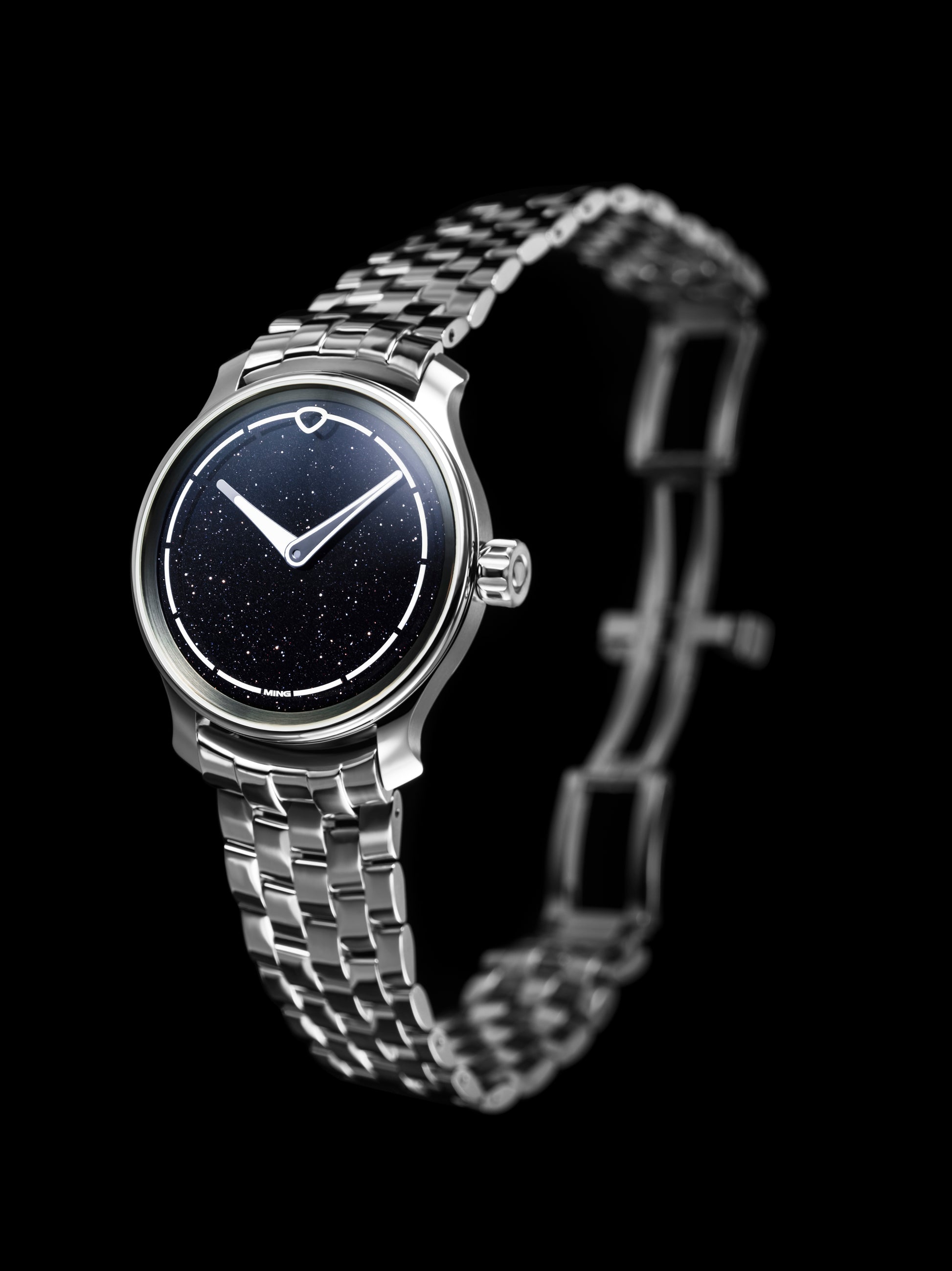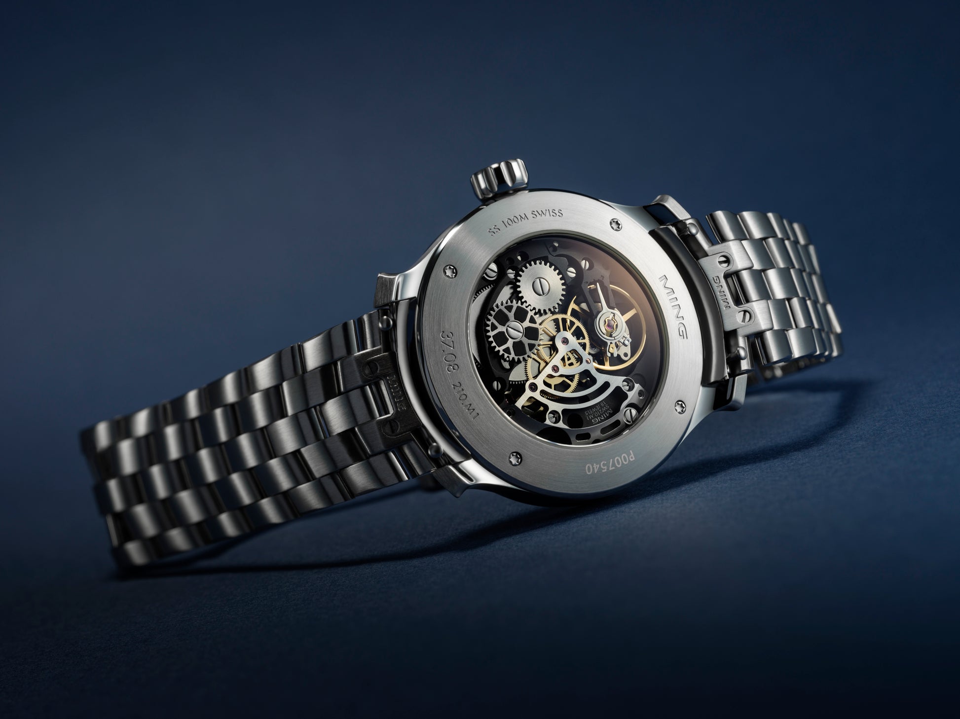 Powering the watch is the hand-winding Sellita SW210.M1 in our unique execution of skeletonized rhodium bridges and a dark matte anthracite base. We tried many strap combinations, but the team unanimously felt the watch was best paired with our 20mm second generation universal bracelet to enhance the overall shine of the piece. It features sculpted leaf links, quick release, hidden double butterfly clasp, and is also compatible with any other 20mm-lug width MING piece you might already own.