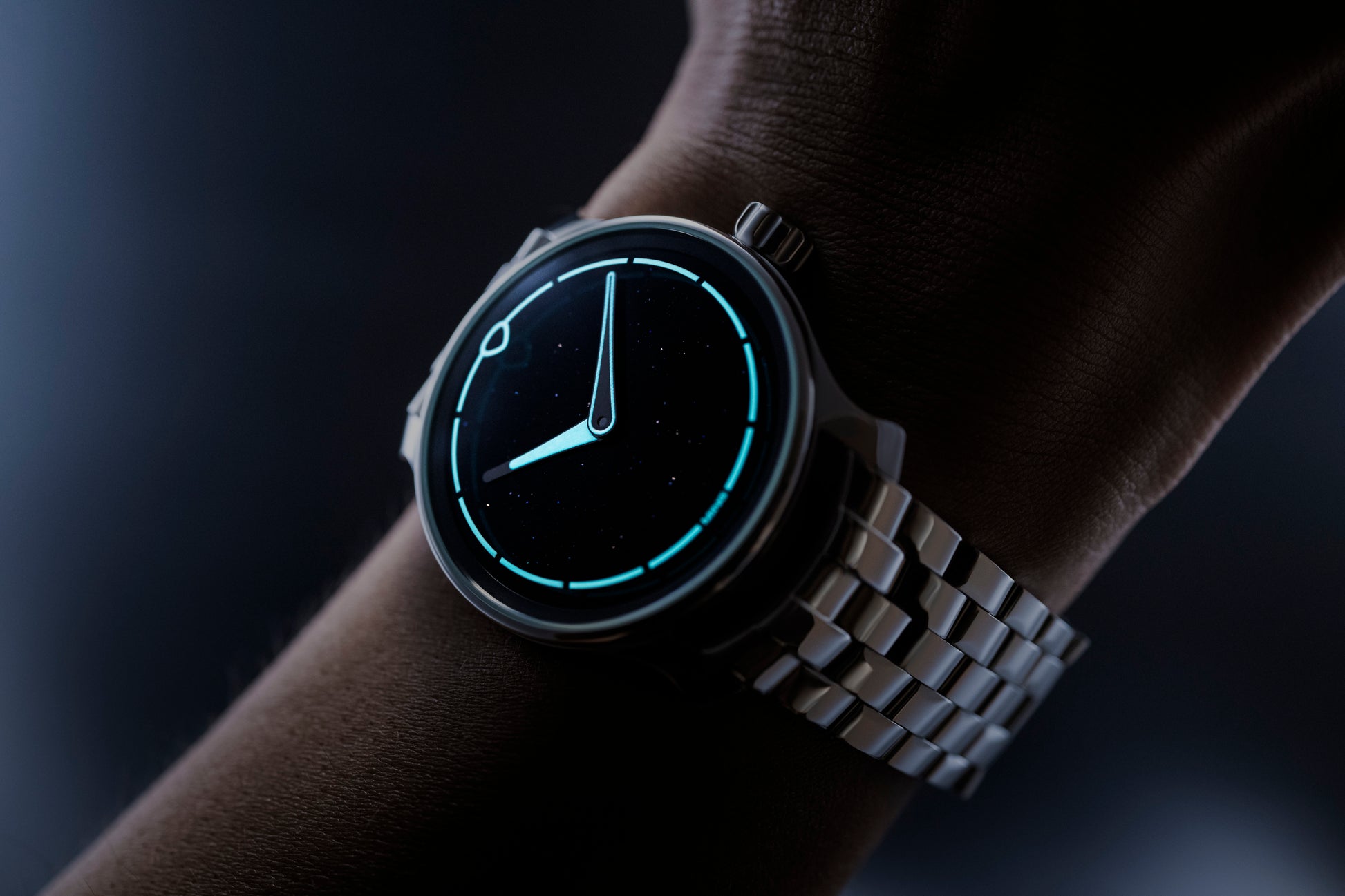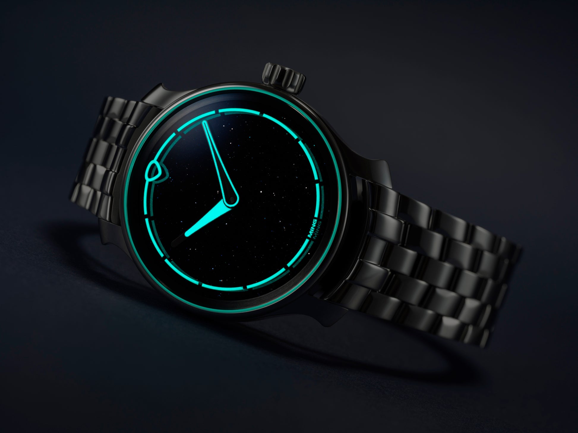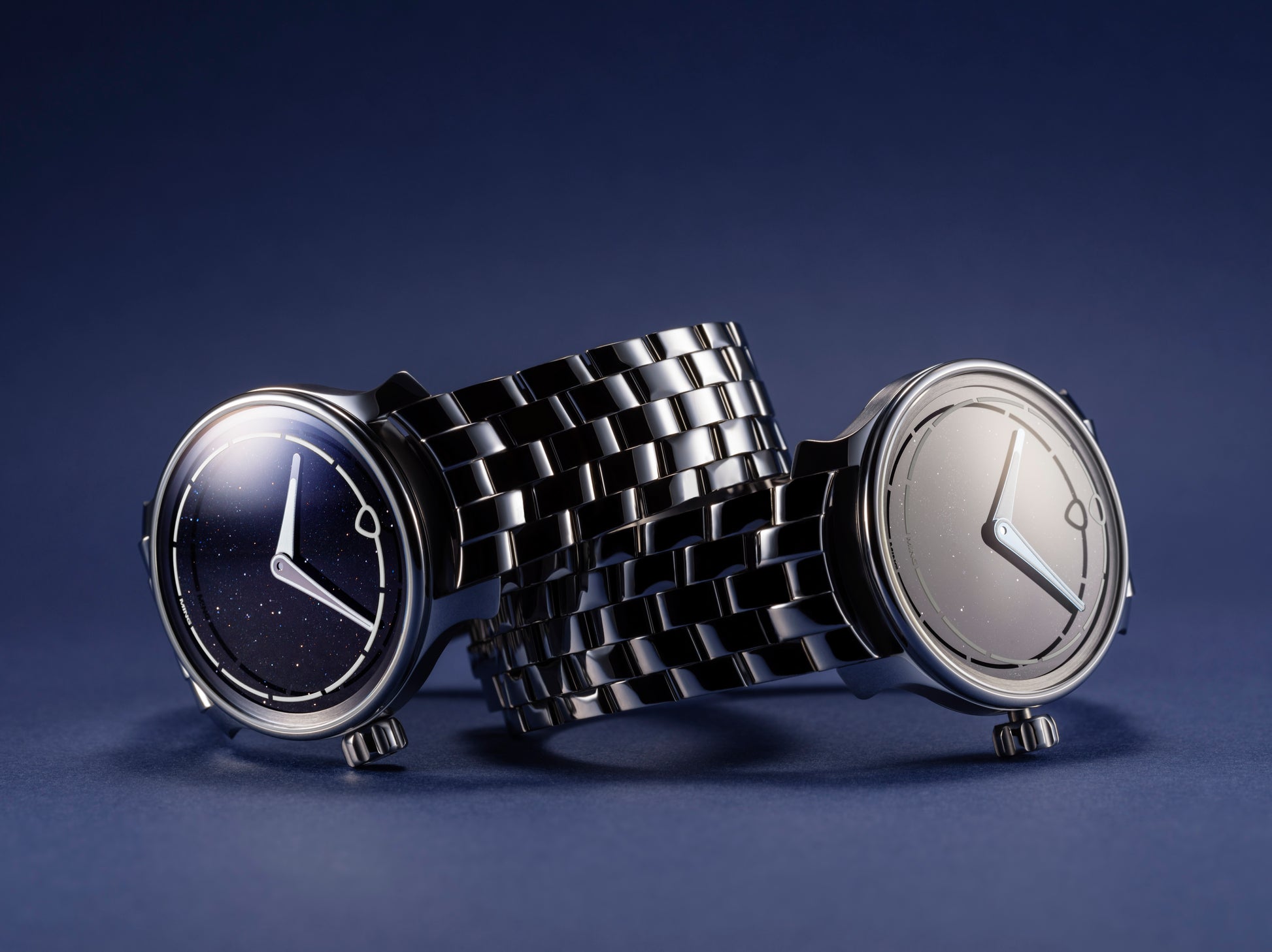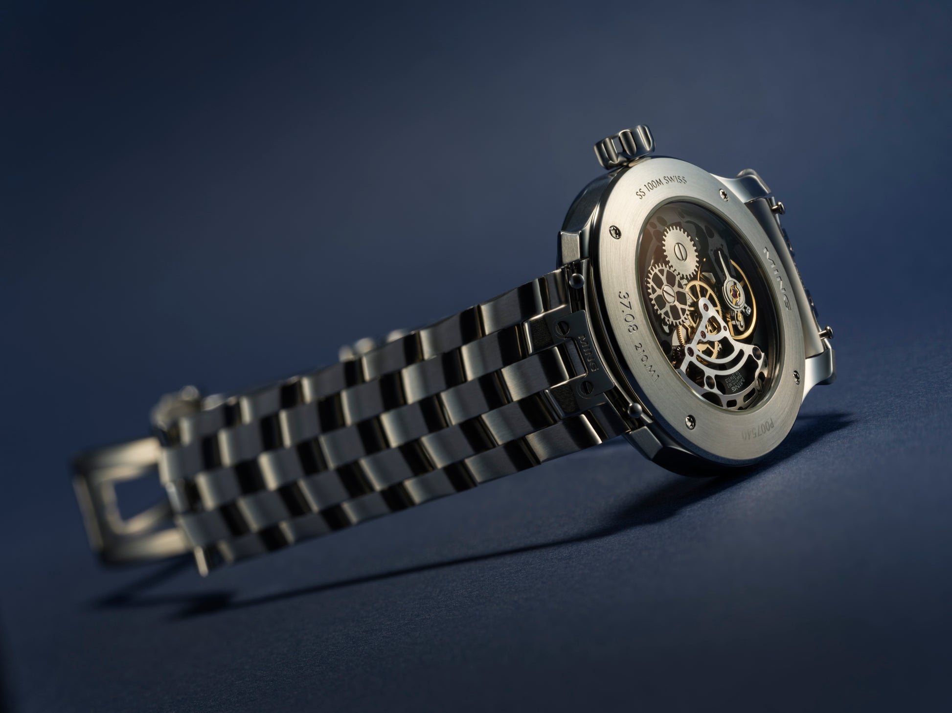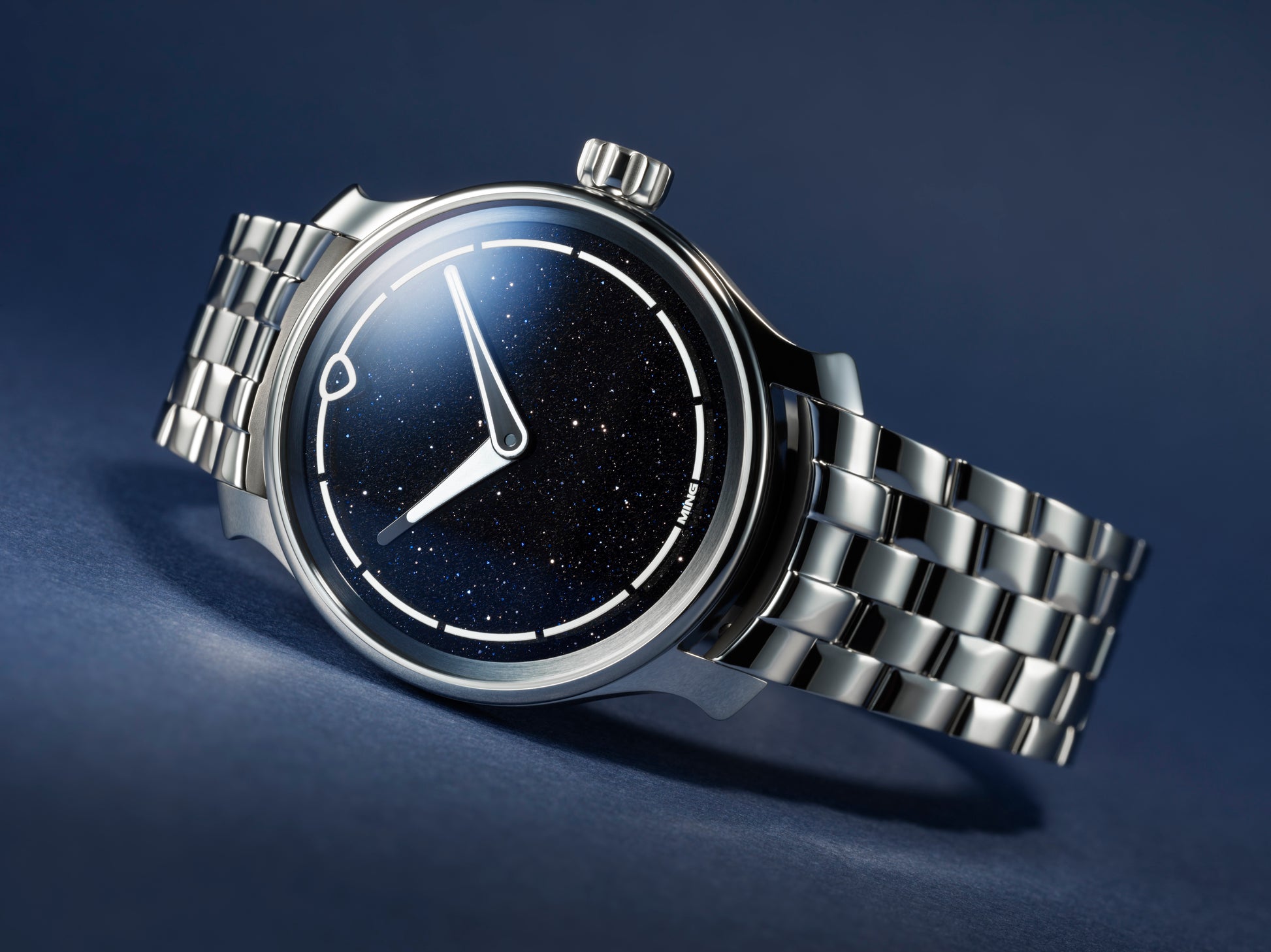 Powering the watch is the hand-winding Sellita SW210.M1 in our unique execution of skeletonized rhodium bridges and a dark matte anthracite base. We tried many strap combinations, but the team unanimously felt the watch was best paired with our 20mm second generation universal bracelet to enhance the overall shine of the piece. It features sculpted leaf links, quick release, hidden double butterfly clasp, and is also compatible with any other 20mm-lug width MING piece you might already own.