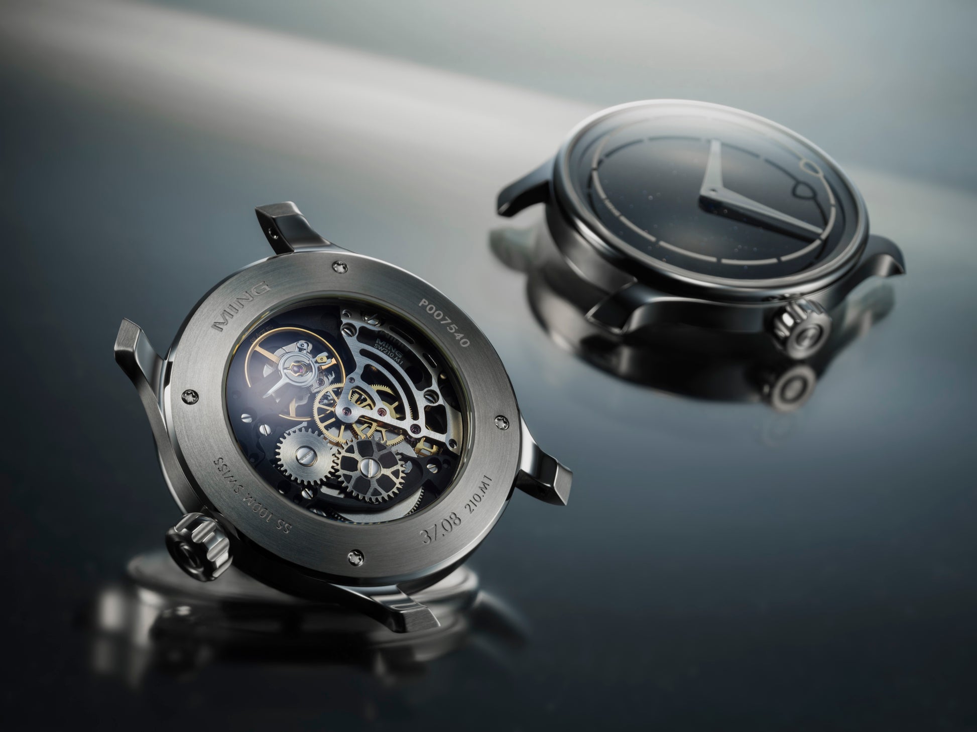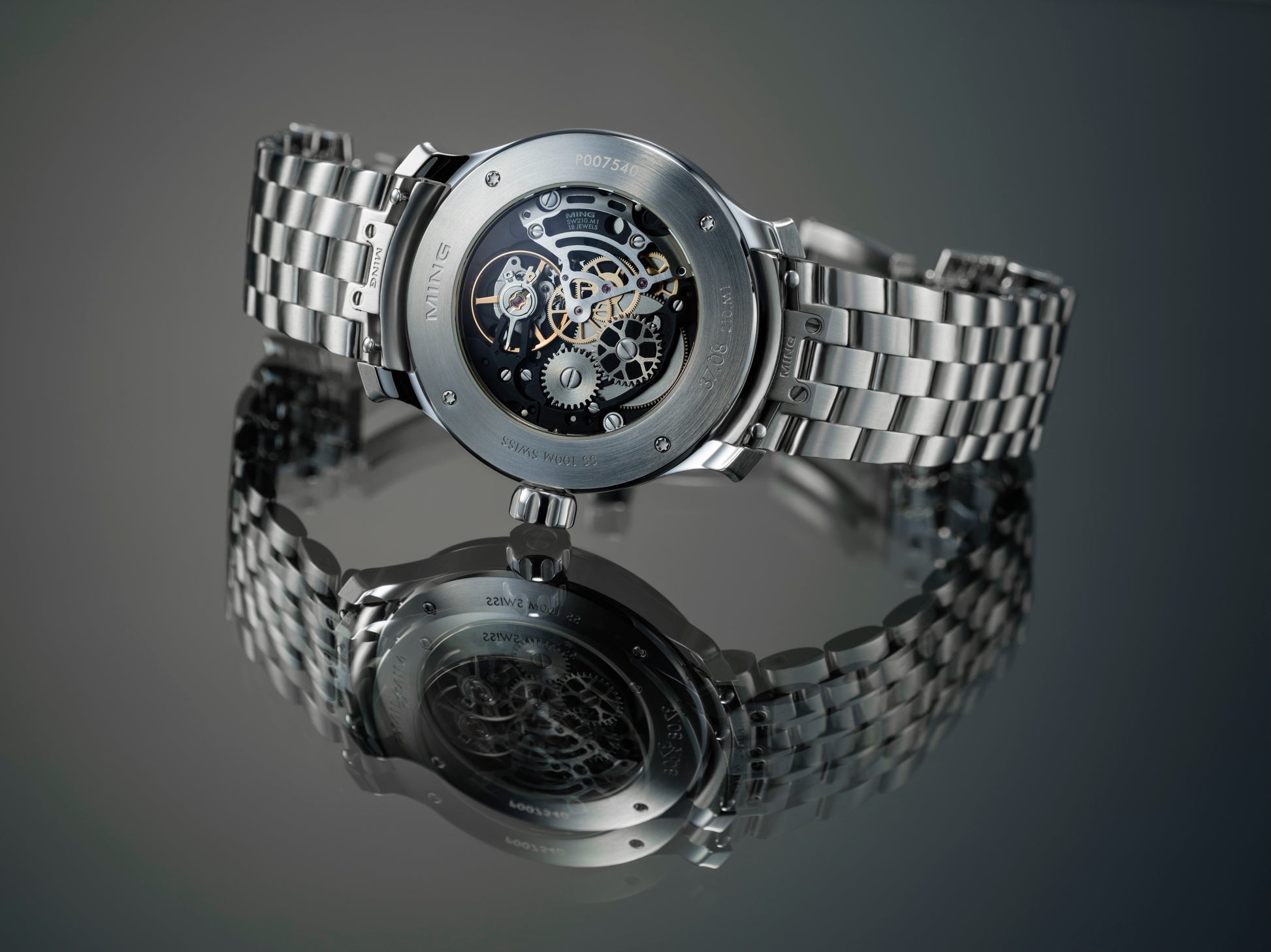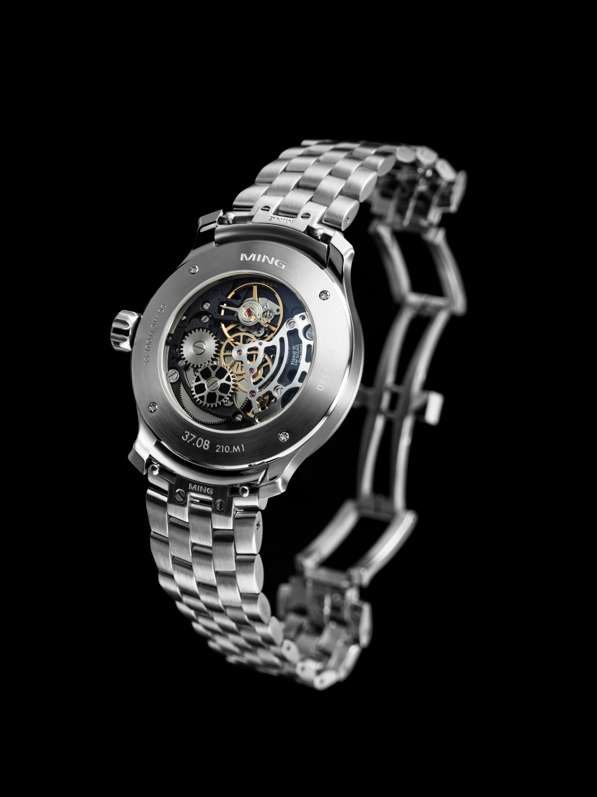 - Sellita for MING SW210.M1, anthracite skeletonized bridges with contrast rhodium circular brushing