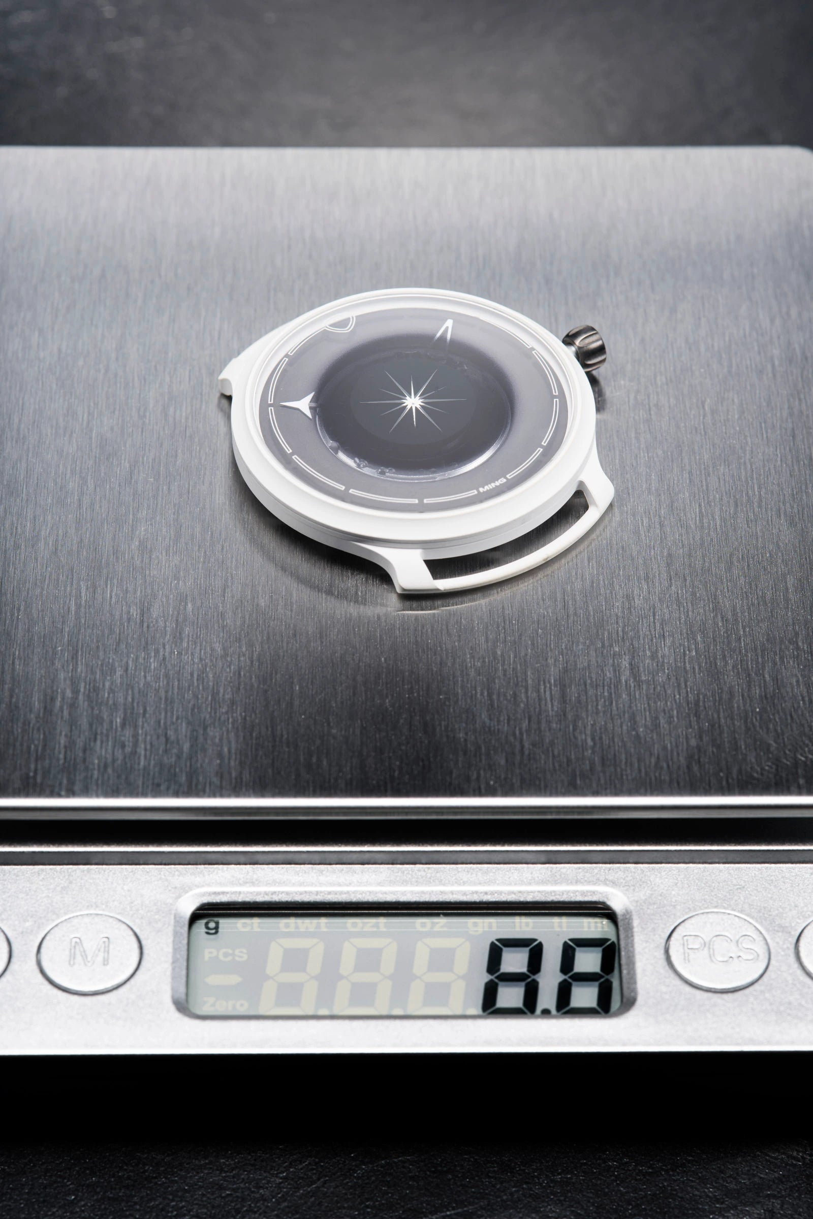 We explored a wide range of ultralight materials including carbon fiber derivatives and hollow-core 3D printing, but ultimately found that AZ31 Magnesium-Aluminium-Zinc-Manganese alloy from Smiths High Performance was both lighter than carbon (1.77g/cc, vs ~2g/cc density), more consistent to produce than hollow 3D printing, and more importantly retained the feel of metal. It is further surface treated by plasmaelectrolytic oxidation by Keronite for corrosion resistance and biocompatibility, with a further composite protective layer. Material choices do not stop there: even the crystal is not sapphire, but instead Corning Gorilla Glass 6 via Knight Optical with an additional hardening treatment. At 2.40g/cc, it is significantly lighter than the 3.98g/cc of traditional sapphire whilst retaining 670 Vickers hardness and high impact resistance.