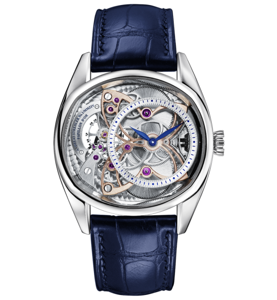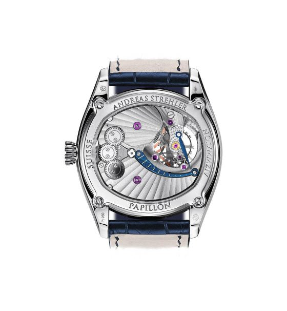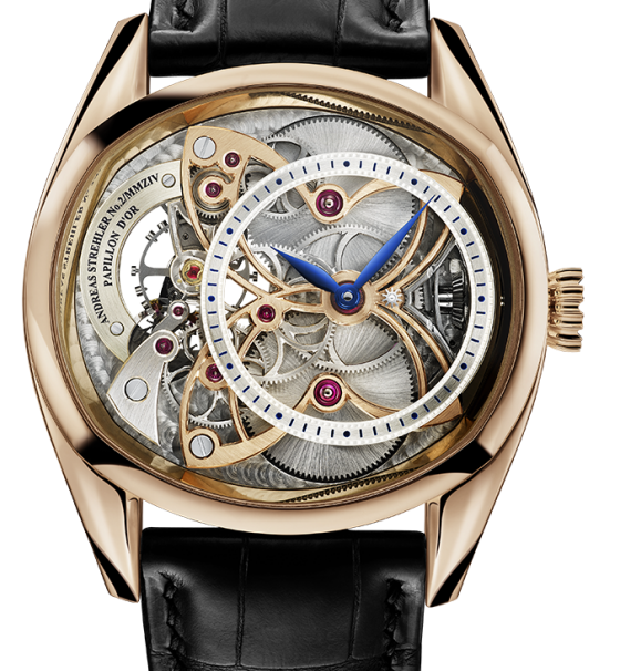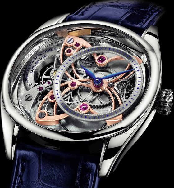 On the back of the Papillon d’Or, the power reserve is indicated. This looks like a simple hand on a simple scale. But in fact it incorporates what is probably the world’s smallest differential gear. This, of course, is built with Andreas Strehler’s own true conical gear wheels. And yet it flies.