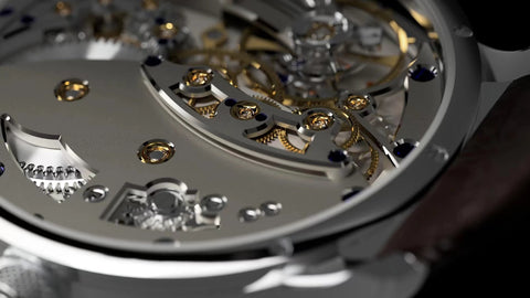 Kaliber KC001.1 機芯直徑 36.6 毫米,高度 5.9 毫米,由德國銀、不銹鋼、鋼和黃金製成。 它擁有 33 顆紅寶石和 145 個零件,頻率為 18000 bph,動力儲存為 45 小時。 裝飾包括黑色拋光、圓周打磨、圓形打磨、噴砂表面、帶尖銳內角的拋光倒角、拋光埋頭孔、直打磨和藍鋼螺絲。 機芯功能包括停秒、動力儲存指示和中央秒針。