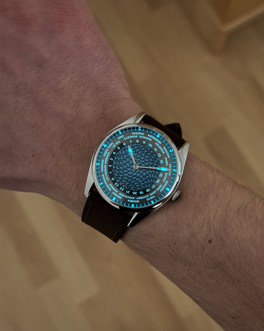 Anodized titanium minute track ring with luminous dots